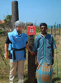 写真の右側に空と海の境界線が見えているのと、空爆などで上半分が破壊されたヤシの木が見えるから、スリランカ北端ジャフナ市の海岸線に近い地雷除去現場だったかな?