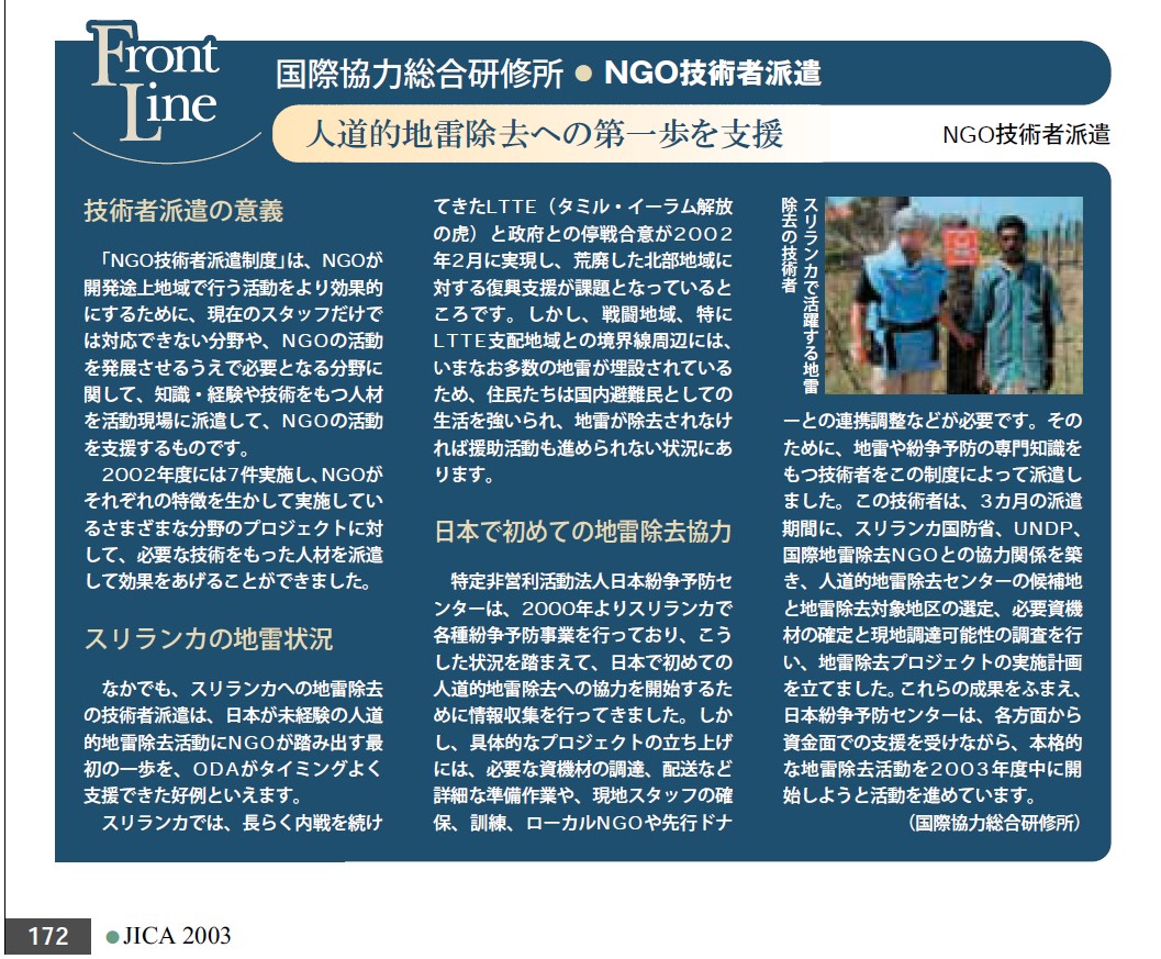 当時のNGOスリランカ代表駐在員から「地雷除去プロジェクトの立ち上げは、絶対に無理だから、早く諦めて帰国した方が良い」と、真顔で言われたが、約15ヶ月間かけて準備し、2004年1月外務省NGO無償支援協力資金1億円弱を得て地雷除去プロジェクトを立ち上げた。